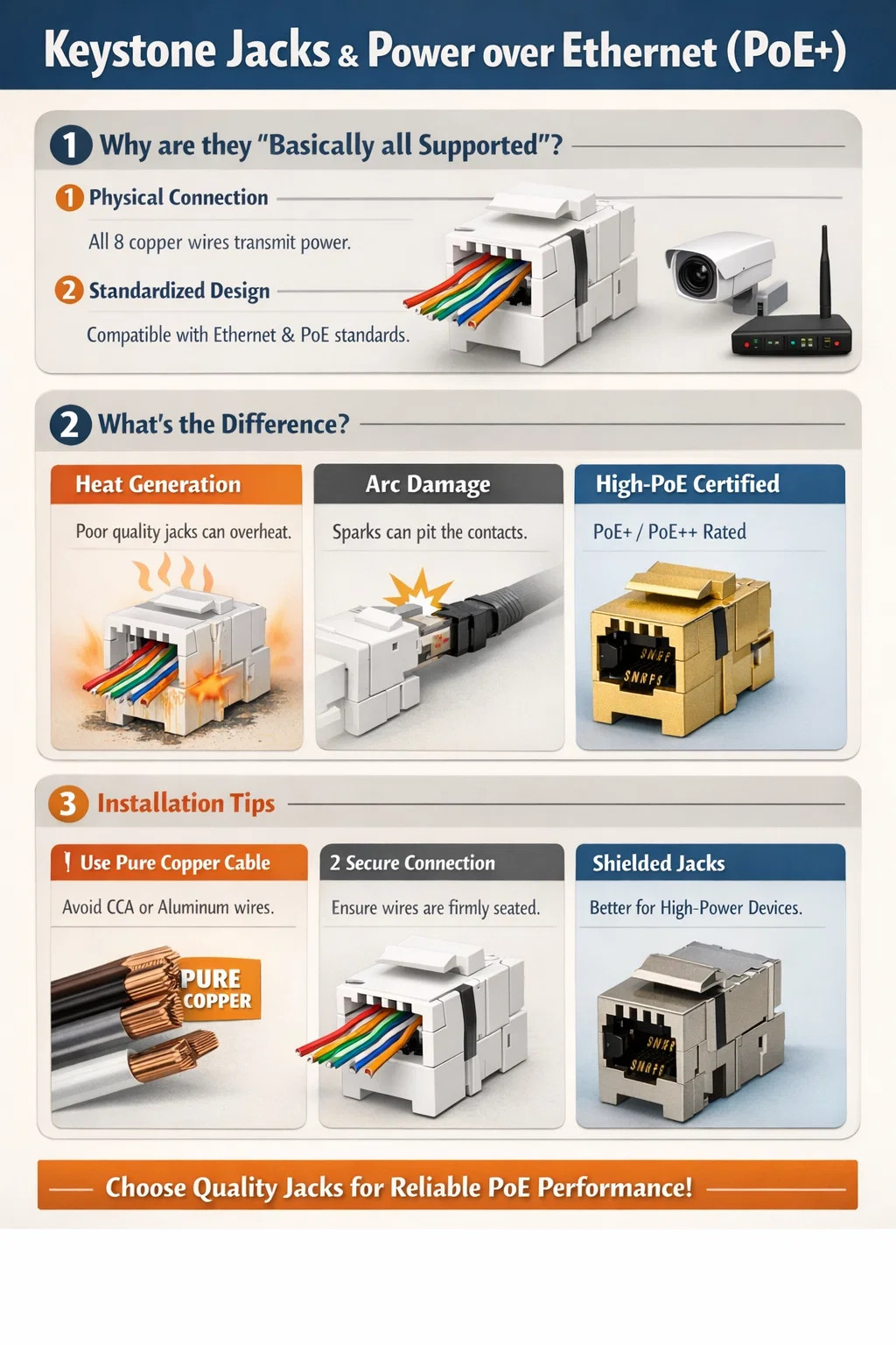 De overgrote meerderheid van standaard netwerkkabelconnectoren ( Keystone-aansluitingen ) ondersteunen fysiek Power over Ethernet (PoE), maar niet alle producten zijn even betrouwbaar onder daadwerkelijke hoge belasting.